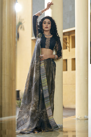 • Dove Grey Zari Woven Cotton Linen Blend Saree
