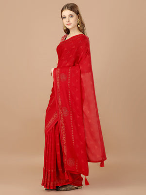 Jacquard designs makes Georgette sarees attractive. Jacquard designs are a product of incredible hard work of designers as they are highly intricate and detailed. That’s perhaps why women love to adorn this beautiful saree for various occasions.