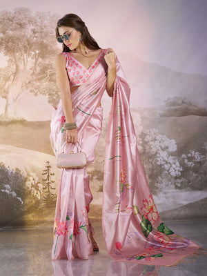 Peach Silk Chiffon Viscose Border Floral Printed Saree Saree With Blouse Piece