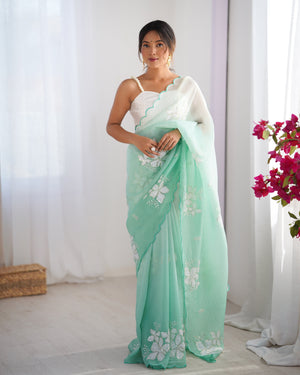 Sea Green Soft Linen Silk With Chikankari Weaved Border Saree With Blouse Piece