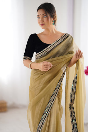 Pista Organza Sequins Embroidery Work With Cut Work Border Saree With Blouse Piece