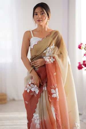 Camel Brown Twill Net Sequins And Cording Embroidery Work Saree With Blouse Piece