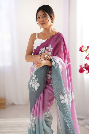 Purple Fendy Satin Two Tone Sequins Hand Work Lace Border Saree With Blouse Piece
