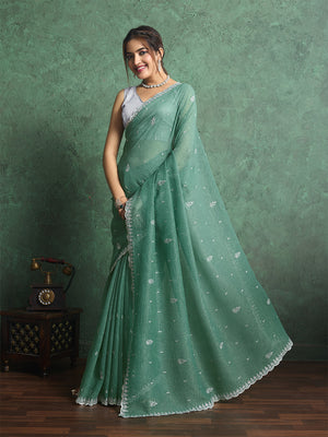 Green Georgette Swarovski Stone Embellished Printed Saree With Blouse Piece