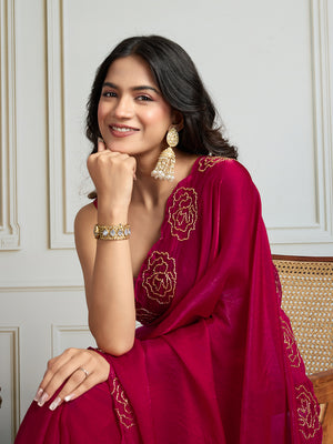 Lavender Embellished Beads And Stones Pure Chiffon Saree With Blouse Piece