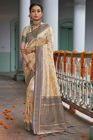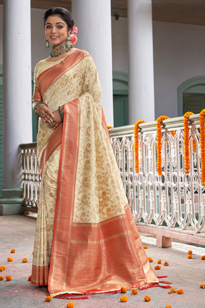 • Cream Banarasi Silk Saree With Blouse