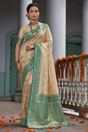 • Cream & Green Banarasi Silk Saree With Blouse Piece
