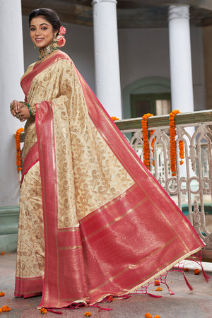 • Cream & Pink Banarasi Silk Saree With Blouse Piece