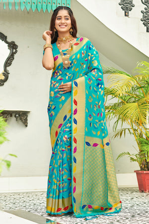 • Turquoise Banarasi Silk Saree With Blouse
