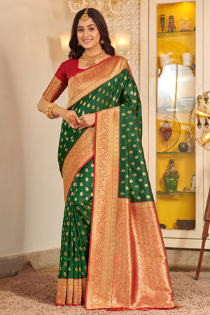 • Dark Green Banarasi Silk Saree With Blouse