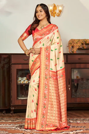 • Cream & Red Banarasi Silk Saree With Blouse Piece