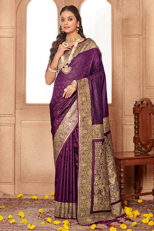 • Purple Banarasi Silk Saree With Blouse