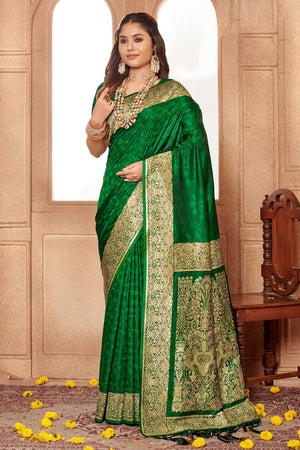• Green Banarasi Silk Saree With Blouse