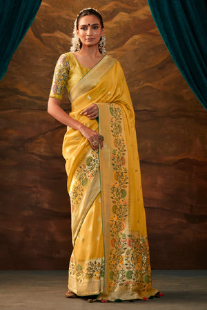 Karagiri Pale Canarry Yellow & Green Printed Patola Silk Saree With Blouse Piece