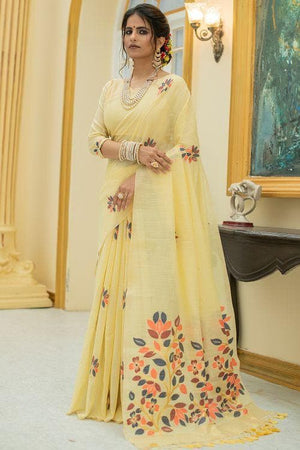 • Buttermilk Yellow Linen Blend Saree