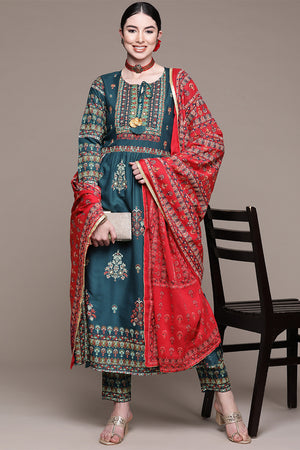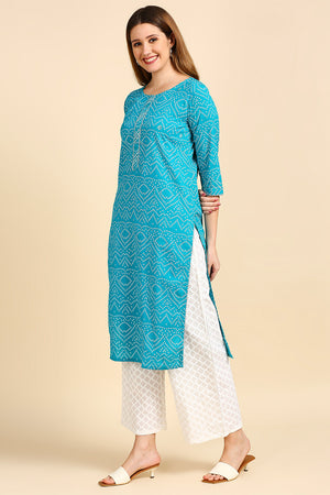 • Teal Blue Ethnic Motifs Printed Straight Kurti