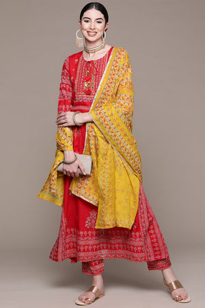 • Red Ethnic Motifs Printed Thread Work Kurta set