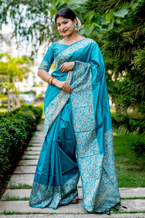 • Firozi Blue Raw Silk Saree With Blouse Piece