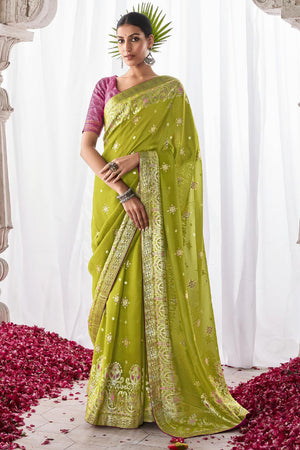• Green Viscose Dola Silk Saree With Blouse Piece