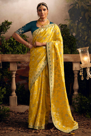 • Yellow Viscose Dola Silk Saree With Blouse Piece
