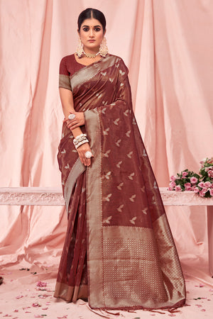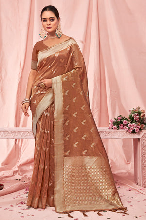 • Brown Zari Woven Kota Cotton Saree With Blouse Piece
