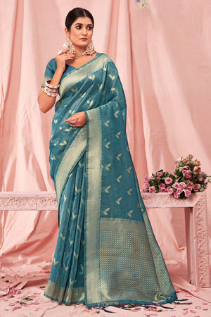 • Sky Blue Zari Woven Kota Cotton Saree With Blouse Piece