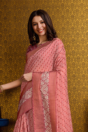 • Pink Cotton Saree With Blouse Piece