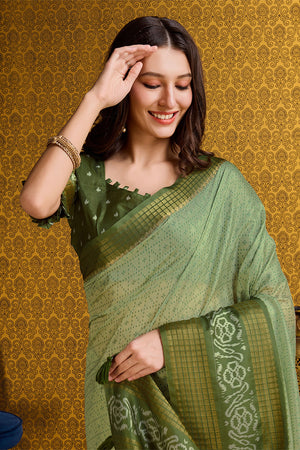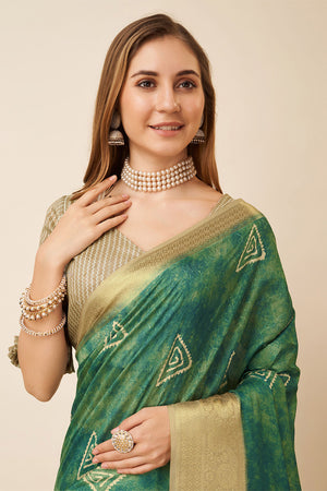• Green Silk Geometric Printed Zari Saree