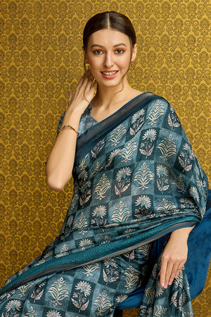 • Teal Silk Ethnic Motifs Printed Saree