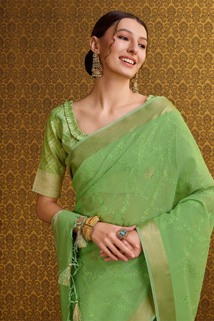 • Green Organza Saree With Blouse Piece