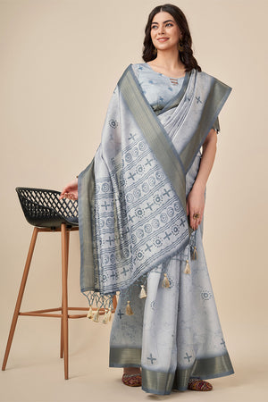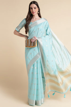 • Blue Linen Blend Silk Saree With Blouse Piece