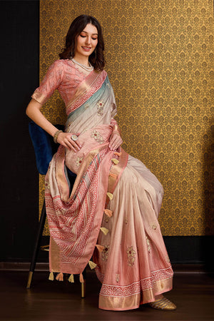 • Pink Linen Blend Silk Saree With Blouse Piece