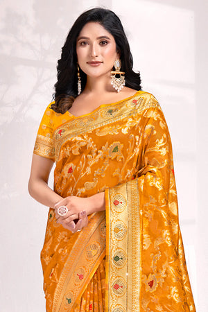 • Mustard Banarasi Silk Saree With Blouse Piece
