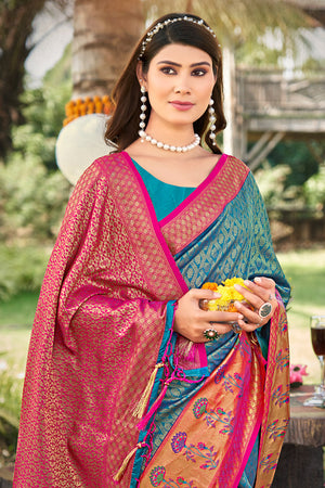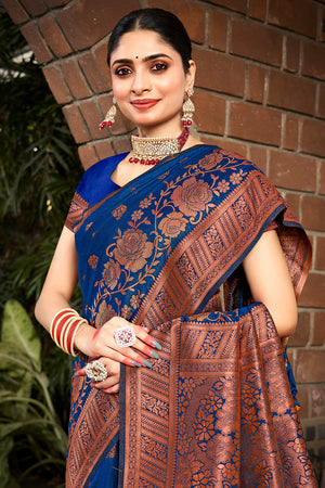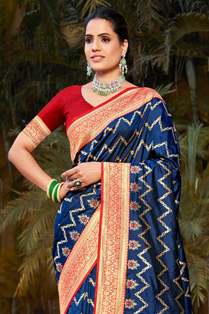• Blue Banarasi Silk Saree With Blouse Piece