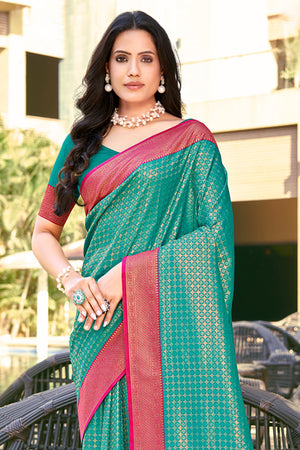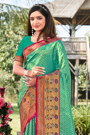 • Sea Green Banarasi Silk Saree With Blouse Piece