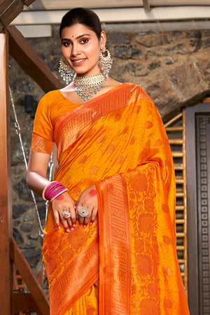 • Orange Banarasi Silk Saree With Blouse Piece