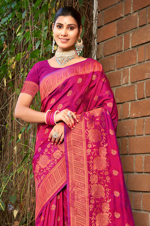 • Pink Banarasi Silk Saree With Blouse Piece