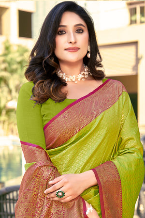 • Mehendi Green Banarasi Silk Saree With Blouse Piece