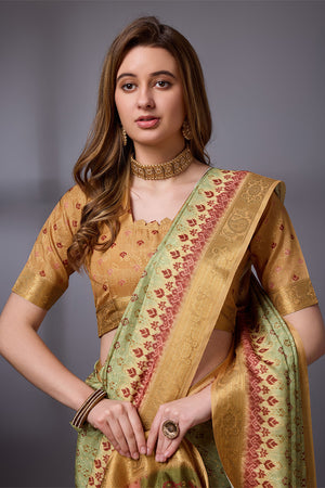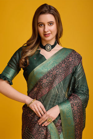 • Mehendi Green Silk Chiffon Saree With Blouse Piece