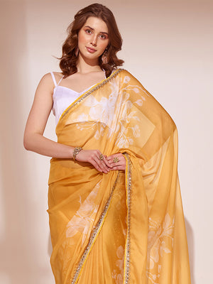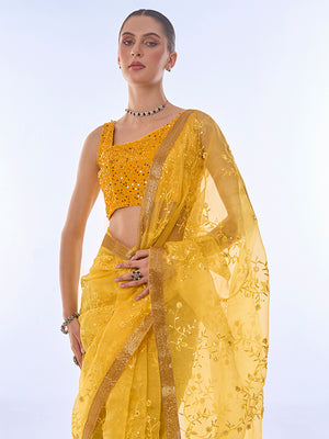 • Yellow Organza Saree With Blouse Piece