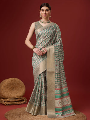 • Green Cotton Digital Print Saree With Blouse Piece