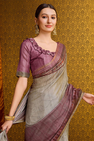 • Grey Cotton Digital Print Saree With Blouse Piece