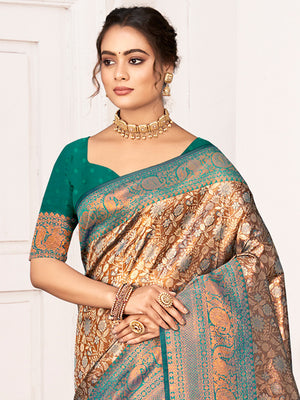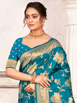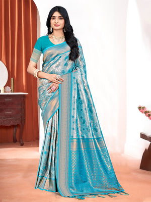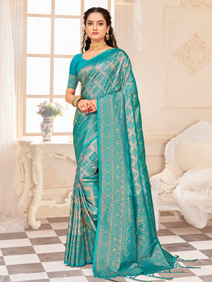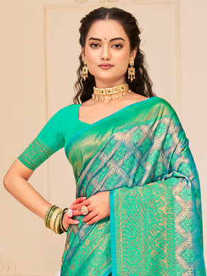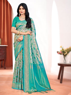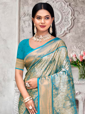 • Turquoise Kanjivaram Silk Saree With Blouse Piece