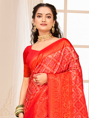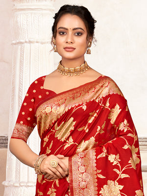 • Red Kanjivaram Silk Saree With Blouse Piece