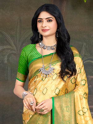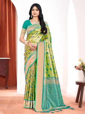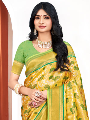 • Yellow Banarasi Silk Saree With Blouse Piece