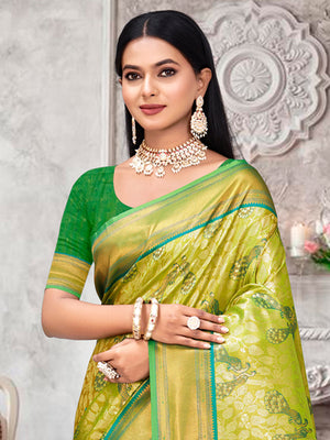 • Parrot Green Kanjivaram Silk Saree With Blouse Piece