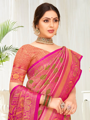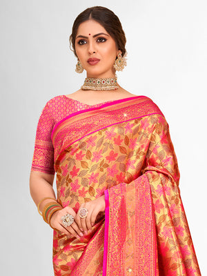 • Light Pink Banarasi Silk Saree With Blouse Piece