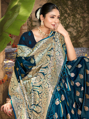 • Navy Blue Satin Silk Saree With Blouse Piece