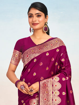 • Navy Blue Banarasi Silk Saree With Blouse Piece