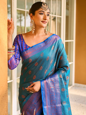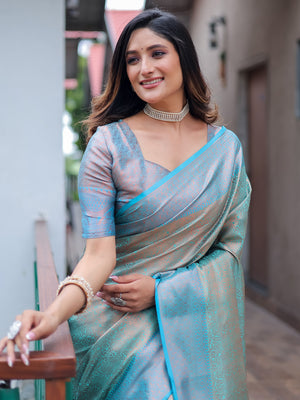 • Turquoise Blue Kanjivaram Silk Saree With Blouse Piece